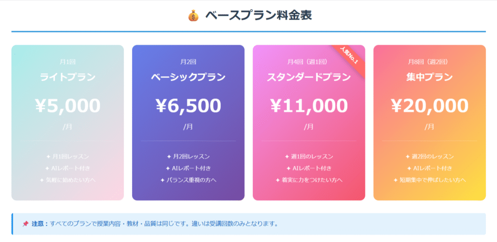 すべてのベースプランで、授業内容・教材・品質は統一されています。違いは受講回数のみです。