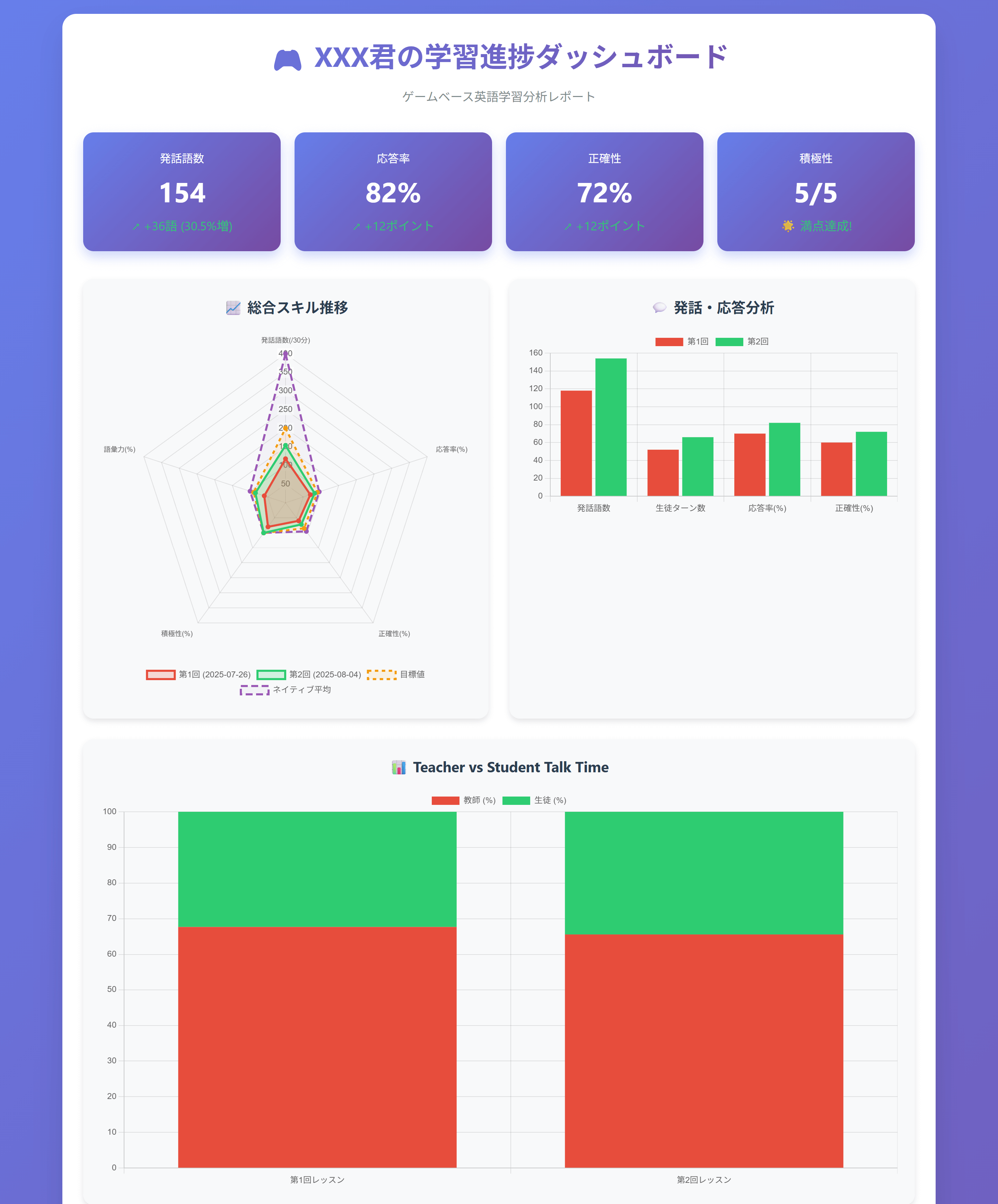 3. AIレポートによる学習可視化 すべてのレッスンにはAIによる学習レポート機能が標準装備されています。お子さんの発話量、使用した英語表現、理解度などが可視化され、保護者の方も学習進捗を確認できます。