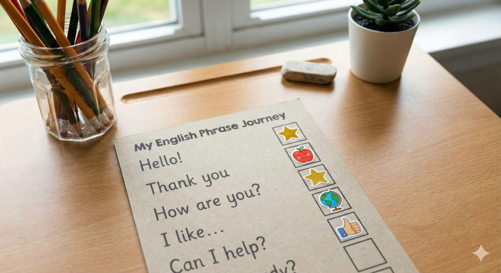 シールやチェック表で「今日言えたフレーズ」を残すと、子どもが成長を実感しやすいです。見える化はやる気の維持に向いています。